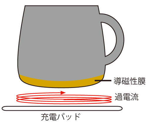 充電パット製品内部で発生した磁場からコップに埋め込まれた 導磁性膜を通して渦電流を発生させてコップの底から発熱させています。